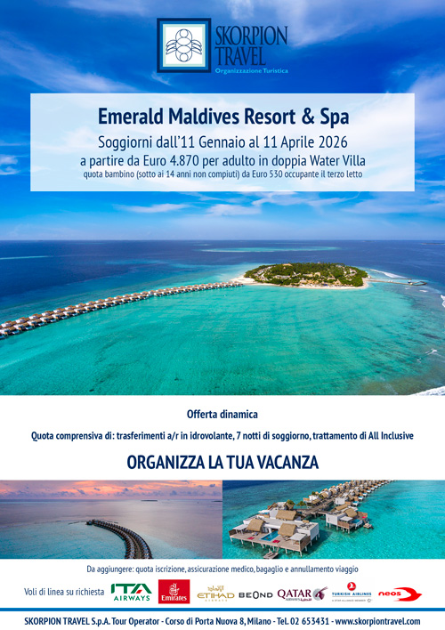 Speciale Emerald Maldives Resort & Spa: Soggiorni dall'11 Gennaio al 11 Aprile 2026, a partire da Euro 4.870 per adulto in doppia Water Villa, quota bambino (sotto ai 14 anni non compiuti) da Euro 530 occupante il terzo letto. Offerta dinamica. Quota comprensiva di: trasferimenti a/r in idrovolante, 7 notti di soggiorno, trattamento di All Inclusive.