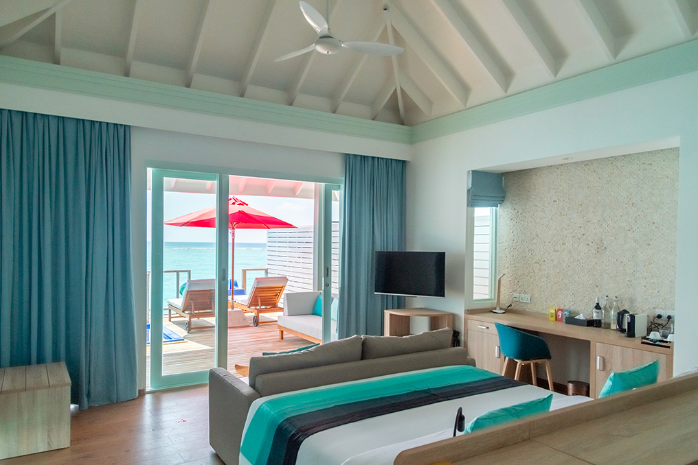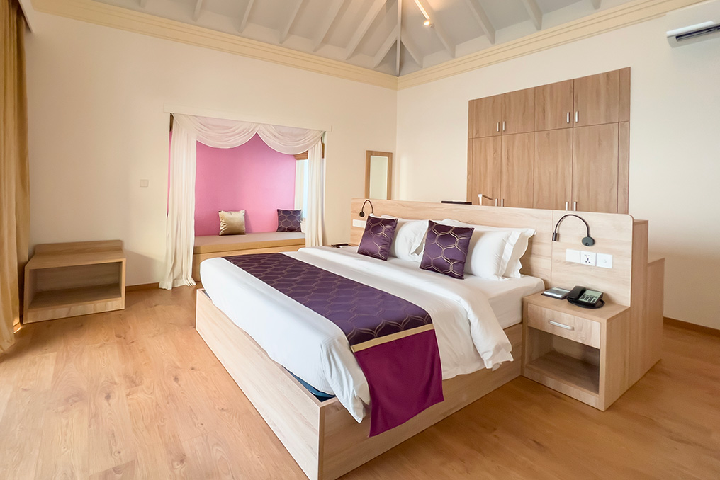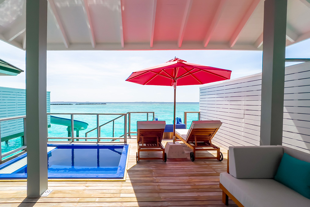 L’isola di 54 ettari è circondata a 360 gradi da una spiaggia di sabbia bianca finissima di quasi 4 km e vanta una barriera corallina di quasi 2 km. Siyam World offre 472 ville suddivise in dieci categorie tra beach e water villas. Tutte le camere hanno la piscina e tutte le overwater hanno gli scivoli.