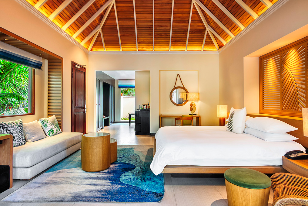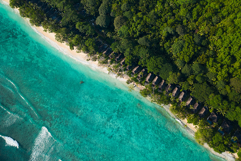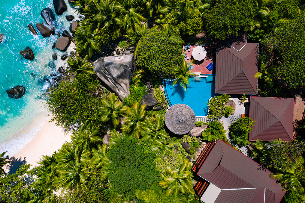 Bastano 45 minuti di barca o 15 minuti di elicottero dall’aeroporto di Mahè per raggiungere questo luogo incantato, un paradiso a poco diventato parco nazionale, dove una vegetazione generosa nasconde il lusso di ville esclusive.