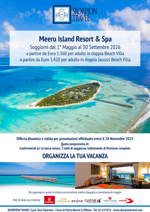 Meeru Island Resort & Spa è situato sull'isola di Meerufenfushi, nell'atollo di Malé Nord, il resort offre un ambiente rilassante ideale per coppie, famiglie e viaggiatori o per chi è semplicemente in cerca di un momento di relax lontano dalla routine quotidiana. Immerso in un mare cristallino e circondato da spiagge di sabbia bianca finissima, si raggiunge con circa 55 minuti di navigazione in motoscafo dall’aeroporto Internazionale Velana di Malé.