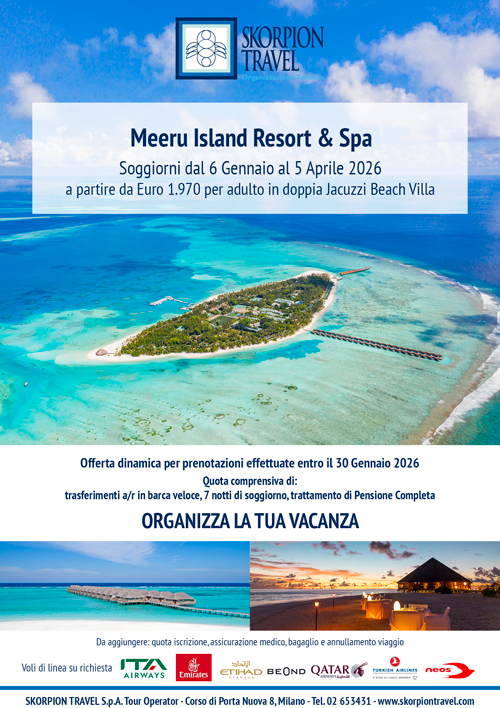 Meeru Island Resort & Spa è situato sull'isola di Meerufenfushi, nell'atollo di Malé Nord, il resort offre un ambiente rilassante ideale per coppie, famiglie e viaggiatori o per chi è semplicemente in cerca di un momento di relax lontano dalla routine quotidiana. Immerso in un mare cristallino e circondato da spiagge di sabbia bianca finissima, si raggiunge con circa 55 minuti di navigazione in motoscafo dall’aeroporto Internazionale Velana di Malé.