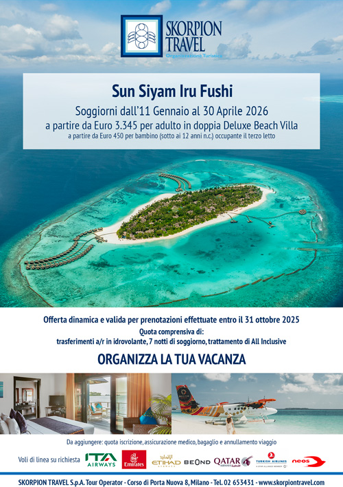 Nell’incantevole atollo di Noonu, circondato da cinquantadue acri di spiaggia bianca e di vegetazione tropicale, sorge Sun Siyam Iru Fushi. L’isola vi accoglie in un’atmosfera idilliaca ed elegante, con le sue lagune turchesi e la barriera corallina che l’avvolgono. È un resort tutto da scoprire: nella raffinatezza delle camere, nelle esperienze culinarie, nel benessere della Spa e nelle molteplici attività per adulti e bambini.