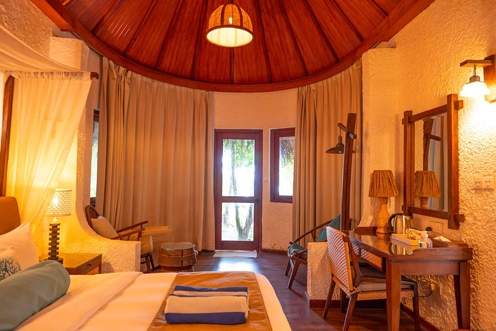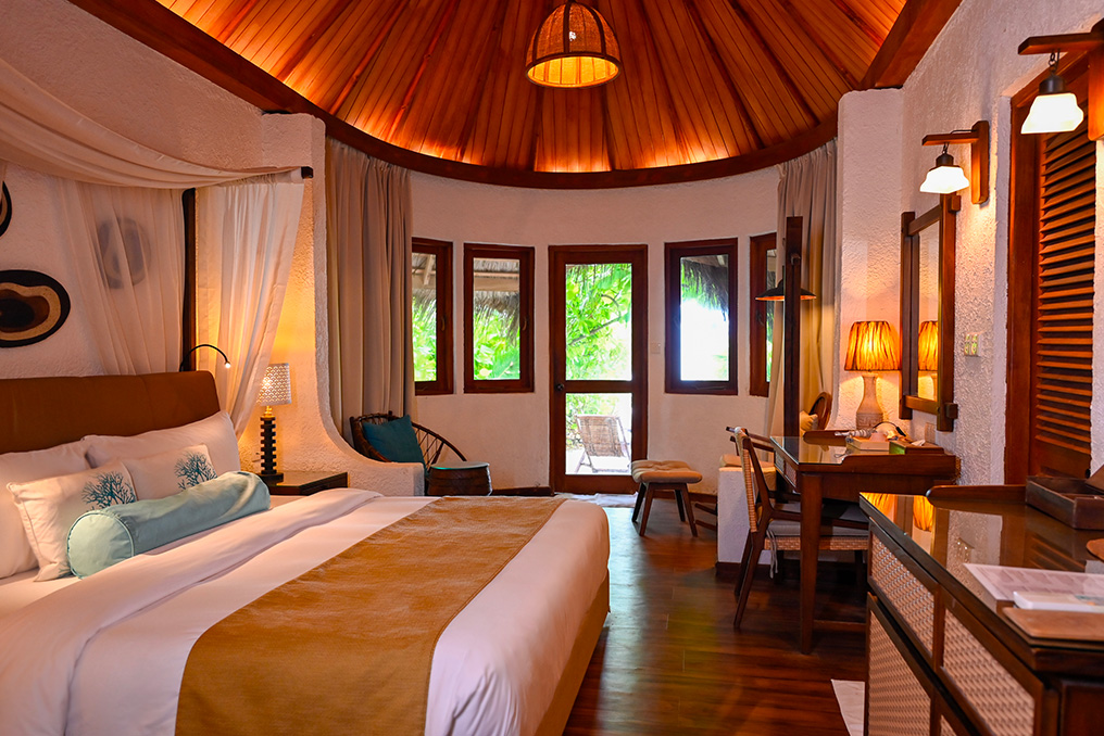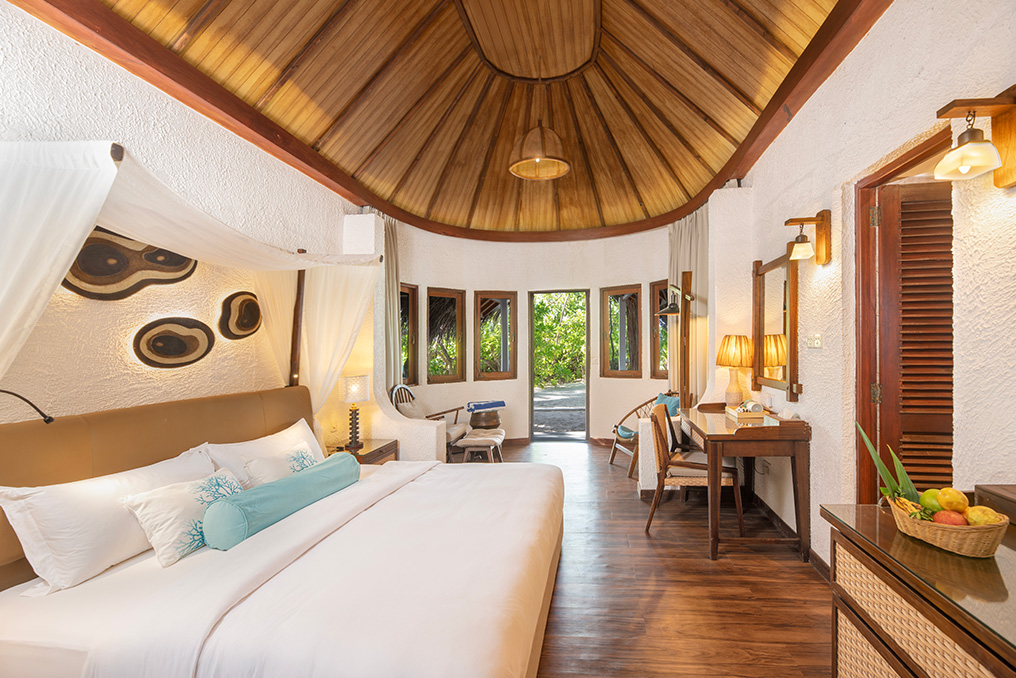 Nell’atollo di Malé Nord, a 50 minuti di barca veloce dalla capitale, Makunudu è ancora così: l’atmosfera che si respirava un tempo alle Maldive è rimasta; affiancata da ambienti informali e da ottimi comfort. Soltanto 36 Deluxe bungalow, protetti dalle palme e di fronte al mare, realizzati nel tradizionale stile maldiviano, con materiali naturali come legno, pietra e corallo, con i tetti in foglie di palma, giardino privato ed il caratteristico bagno all’aperto. Arredati con raffinata semplicità, con mobili e decori dai toni caldi che richiamano i colori della natura circostante. E per non deturpare l’ambiente, alcuni sono stati costruiti attorno alle palme stesse, che sono diventate parte integrante di questi perfetti ed armoniosi alloggi.