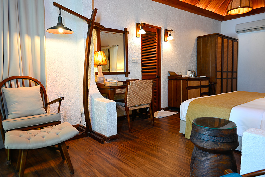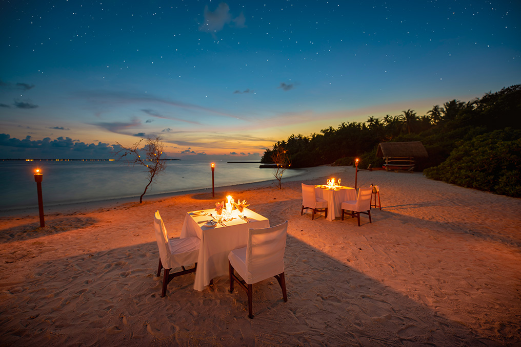 Ogni bungalow è dotato di angolo salotto con scrivania, bagno in stile maldiviano, aria condizionata e ventilatore a pale, telefono, mini-bar, asciugacapelli, cassetta di sicurezza e bollitore per the e caffè. “Ara Iru” significa sol levante: questo è il nome del ristorante, con servizio a buffet per la colazione e il pranzo. La sera l’atmosfera cambia: romantiche cene a lume di candela con menu à la carte e due volte alla settimana buffet e grigliate. La cucina è internazionale, con una grande varietà di pesce, carne e frutta tropicale. Al “Sand Bar” fantastici cocktail e spuntini da gustare con il sottofondo del mormorio delle onde o con una musica soft.