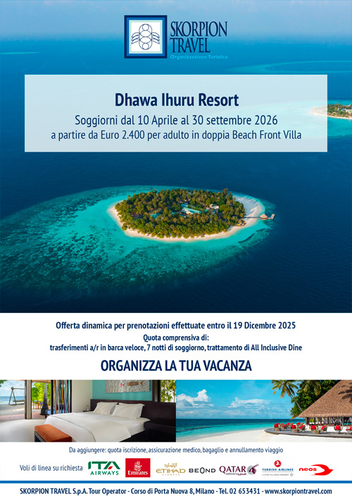 SPECIALE MALDIVE: Soggiorni dal 10 Gennaio al 09 Aprile 2026, a partire da Euro 3.410 per adulto in Beach Front Villa; a partire da Euro 120 per bambino (sotto ai 12 anni n.c.) in terzo letto. Offerta dinamica & valida per prenotazioni effettuate fino a 90 giorni prima della partenza. Quota comprensiva di: trasferimenti a/r in barca veloce, 7 notti di soggiorno in Beach Front Villa, trattamento di All Inclusive ''Dine'', tasse locali, assistenza personale locale.