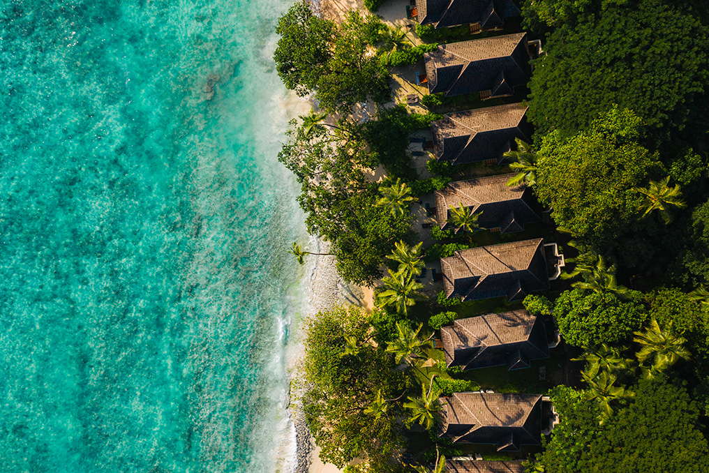 Bastano 45 minuti di barca o 15 minuti di elicottero dall’aeroporto di Mahè per raggiungere questo luogo incantato, un paradiso a poco diventato parco nazionale, dove una vegetazione generosa nasconde il lusso di ville esclusive.